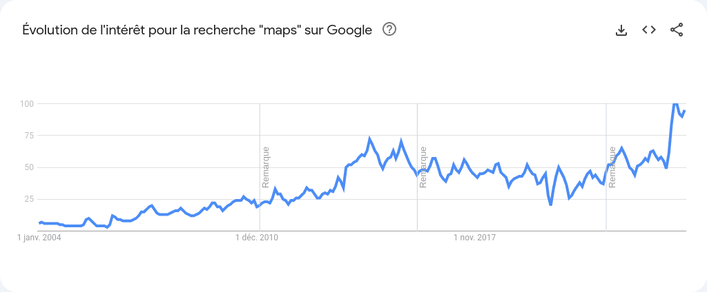 Évolution de la recherche "maps" sur les tendances de recherche... euh pardon les Google trends
