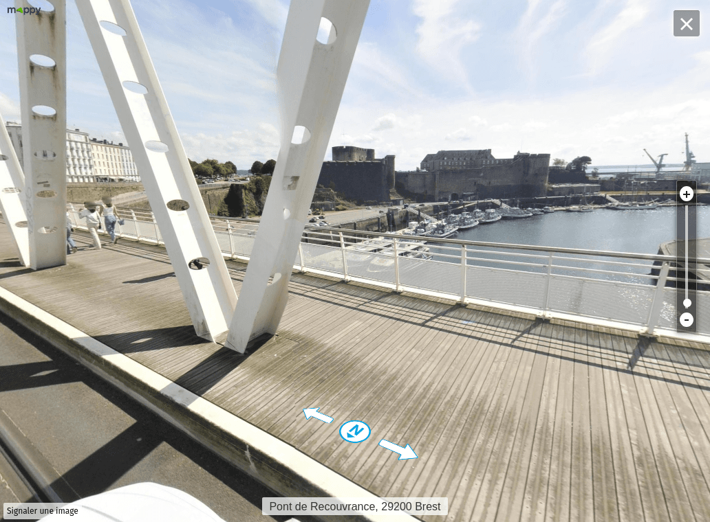 Mappy, le Google Maps français (pour le meilleur et pour le pire), a son propre Street View nommé Urban Dive. Nous y avons trouvé Brest (ici son pont iconique et son chateau fort), et le centre de Quimper, mais il se fait rare dès que l'on quitte les grandes villes.